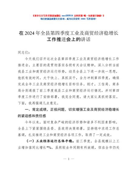 / 在2024年全县第四季度工业及商贸经济稳增长工作推进会上的讲话