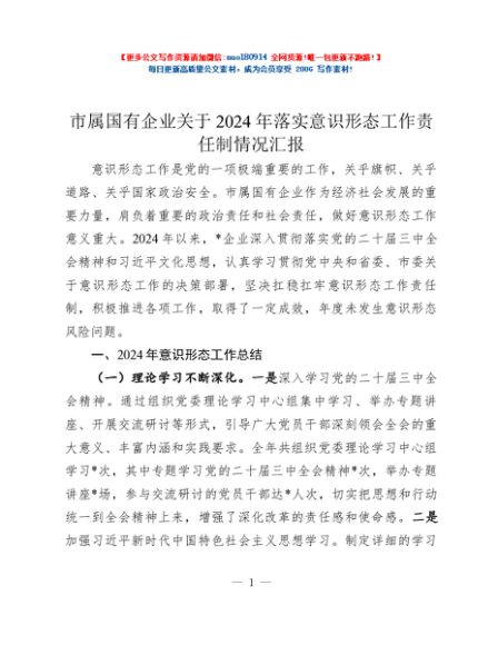 / 市属国有企业关于2024年落实意识形态工作责任制情况汇报