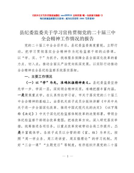 / 县纪委监委关于学习宣传贯彻党的二十届三中全会精神工作情况的报告