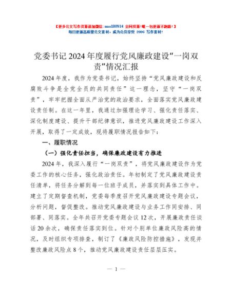 / 党委书记2024年度履行党风廉政建设“一岗双责”情况汇报