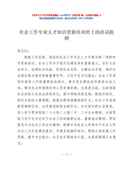 / 社会工作专业人才知识更新培训班上的讲话提纲