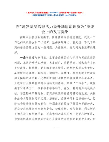 / 在“激发基层治理活力 提升基层治理质效”座谈会上的发言提纲
