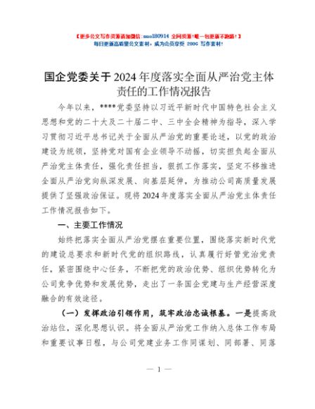 / 国企党委关于2024年度落实全面从严治党主体责任的工作情况报告