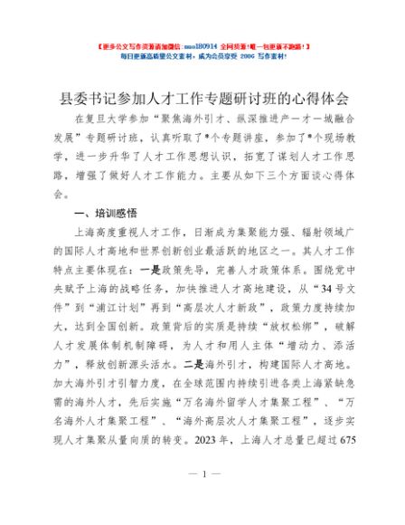 / 县委书记参加人才工作专题研讨班的心得体会
