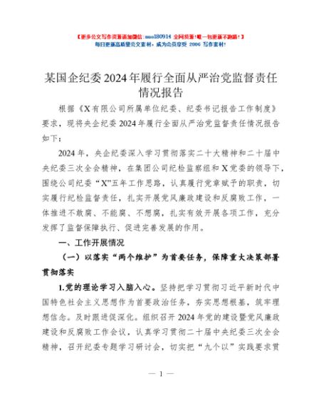 / 某国企纪委2024年履行全面从严治党监督责任情况报告