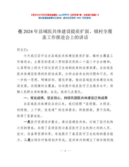 / 在2024年县域医共体建设提质扩面、镇村全覆盖工作推进会上的讲话