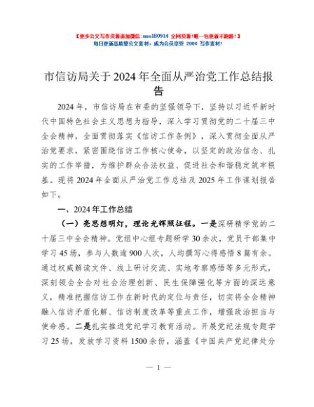 / 市信访局关于2024年全面从严治党工作总结报告