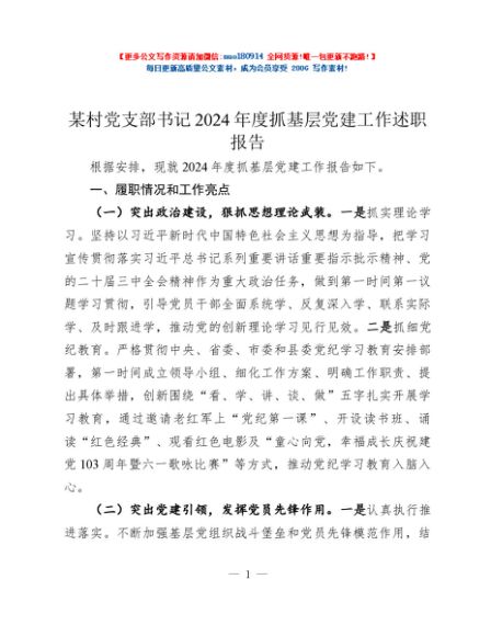 / 某村党支部书记2024年度抓基层党建工作述职报告