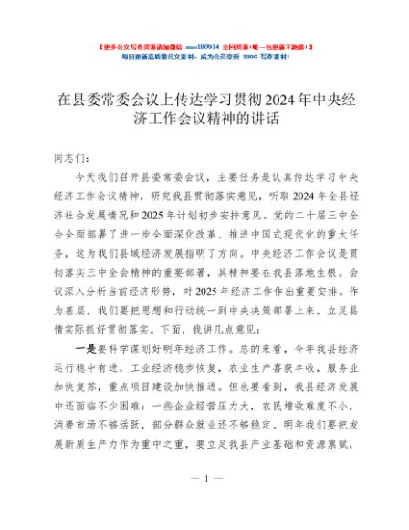 / 在县委常委会议上传达学习贯彻2024年中央经济工作会议精神的讲话