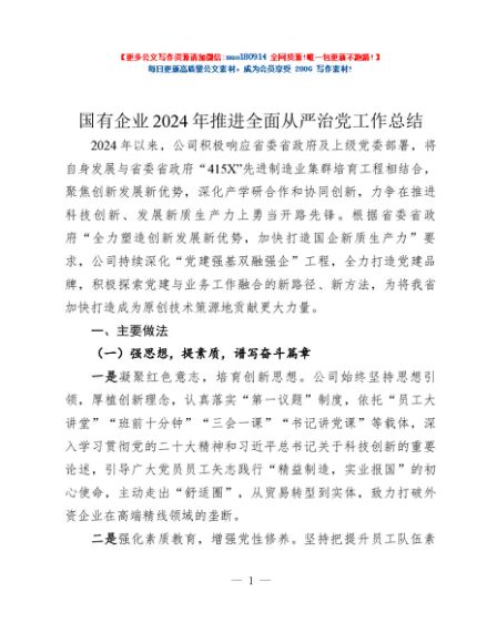/ 国有企业2024年推进全面从严治党工作总结