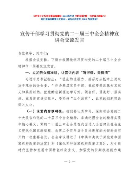 / 宣传干部学习贯彻党的二十届三中全会精神宣讲会交流发言