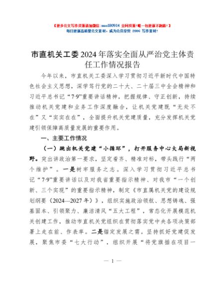 / 市直机关工委2024年落实全面从严治党主体责任工作情况报告