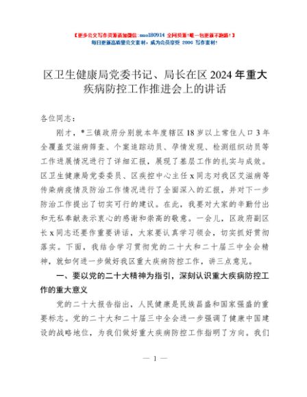 / 区卫生健康局党委书记、局长在区2024年重大疾病防控工作推进会上的讲话