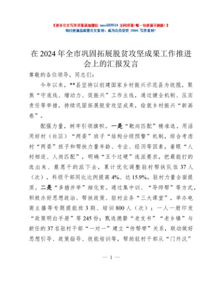 / 在2024年全市巩固拓展脱贫攻坚成果工作推进会上的汇报发言