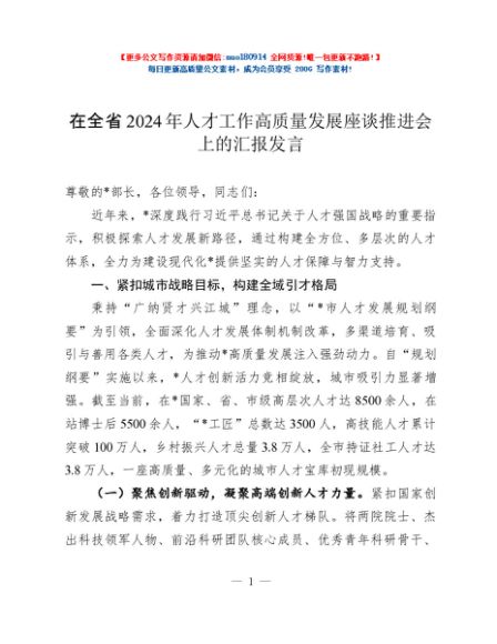 / 在全省2024年人才工作高质量发展座谈推进会上的汇报发言