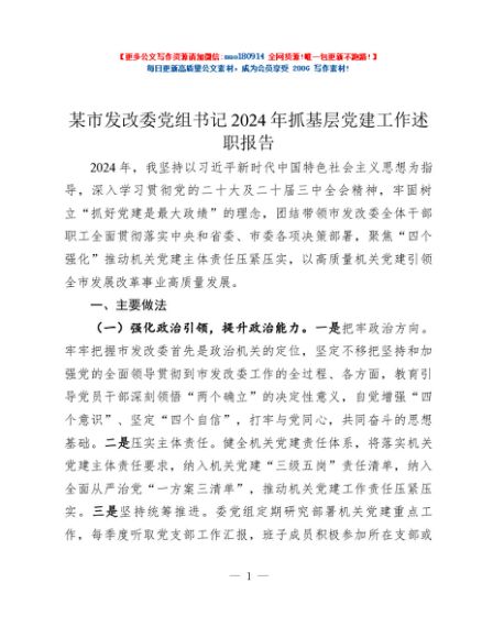 / 某市发改委党组书记2024年抓基层党建工作述职报告