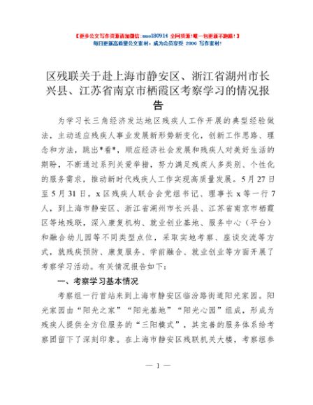 / 区残联关于赴上海市静安区、浙江省湖州市长兴县、江苏省南京市栖霞区考察学习的情况报告