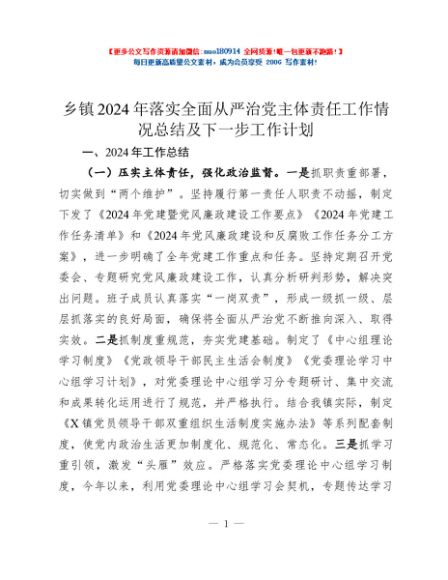 / 乡镇2024年落实全面从严治党主体责任工作情况总结及下一步工作计划