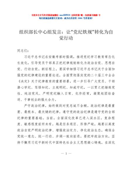 组织部长中心组发言:让“党纪铁规”转化为自觉行动