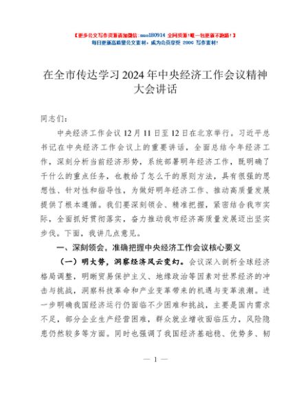 / 在全市传达学习2024年中央经济工作会议精神大会讲话