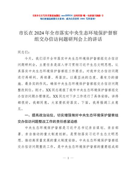 / 市长在2024年全市落实中央生态环境保护督察组交办信访问题研判会上的讲话