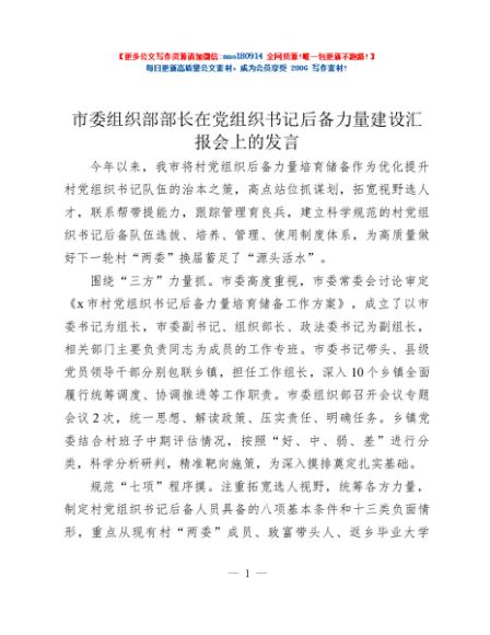 / 市委组织部部长在党组织书记后备力量建设汇报会上的发言