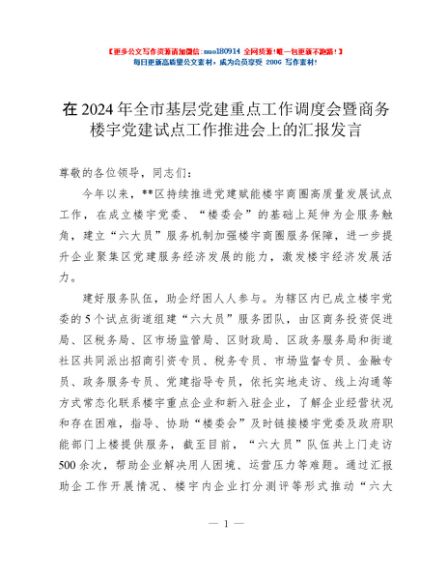 / 在2024年全市基层党建重点工作调度会暨商务楼宇党建试点工作推进会上的汇报发言