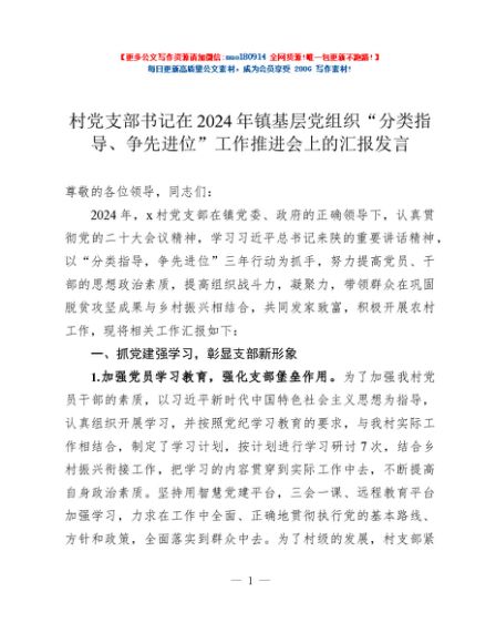 / 村党支部书记在2024年镇基层党组织“分类指导、争先进位”工作推进会上的汇报发言