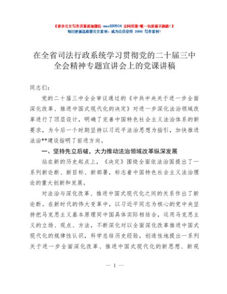 / 在全省司法行政系统学习贯彻党的二十届三中全会精神专题宣讲会上的党课讲稿