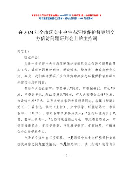 / 在2024年全市落实中央生态环境保护督察组交办信访问题研判会上的主持词