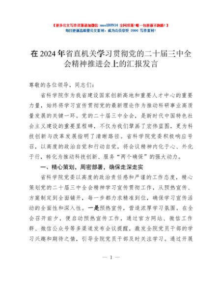 / 在2024年省直机关学习贯彻党的二十届三中全会精神推进会上的汇报发言