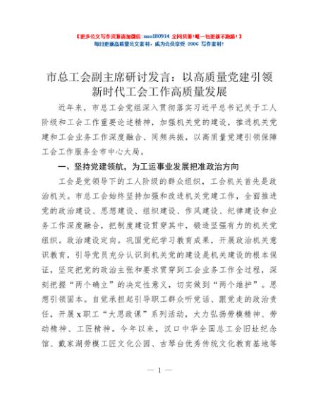 市总工会副主席研讨发言:以高质量党建引领新时代工会工作高质量发展