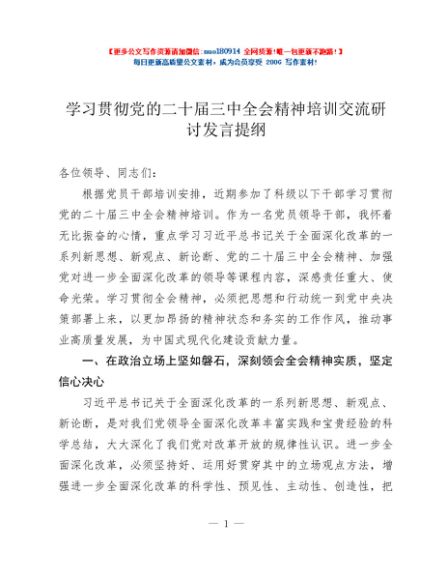 / 学习贯彻党的二十届三中全会精神培训交流研讨发言提纲