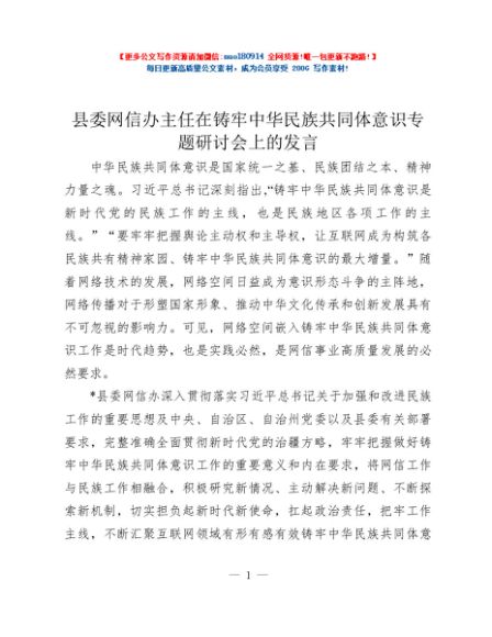 / 县委网信办主任在铸牢中华民族共同体意识专题研讨会上的发言