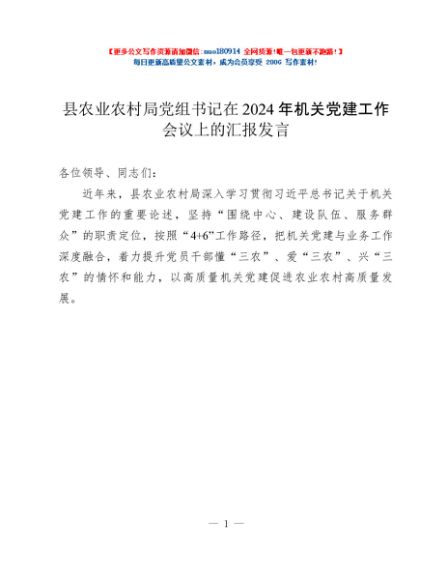/ 县农业农村局党组书记在2024年机关党建工作会议上的汇报发言