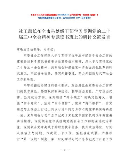 / 社工部长在全市县处级干部学习贯彻党的二十届三中全会精神专题读书班上的研讨交流发言