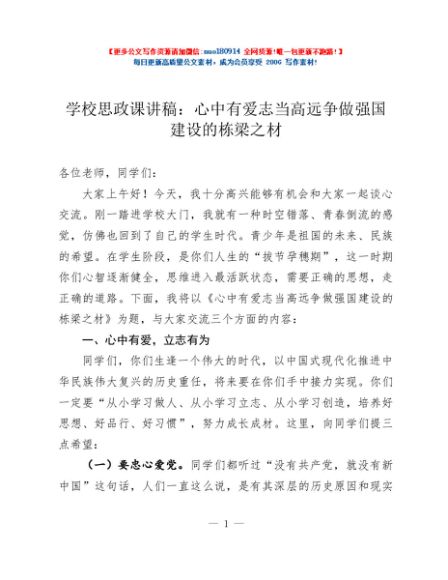 / 学校思政课讲稿:心中有爱 志当高远 争做强国建设的栋梁之材