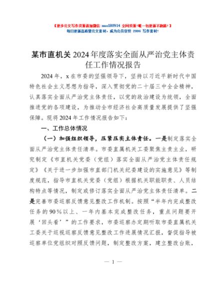 / 某市直机关2024年度落实全面从严治党主体责任工作情况报告