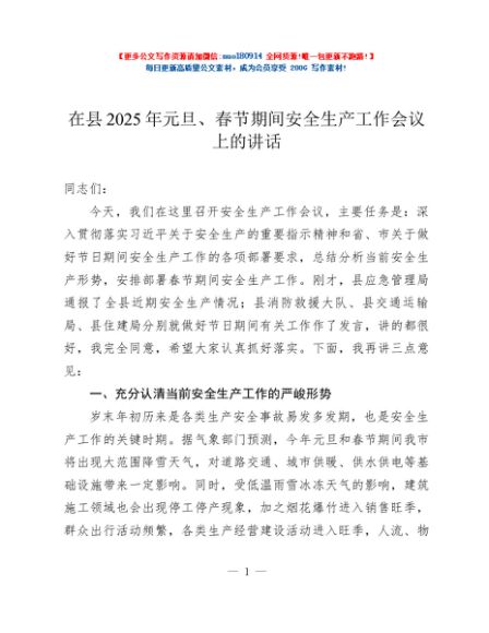 / 在县2025年元旦、春节期间安全生产工作会议上的讲话