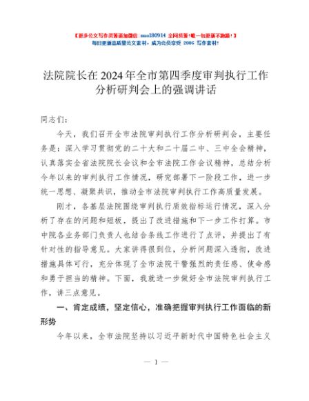 / 法院院长在2024年全市第四季度审判执行工作分析研判会上的强调讲话