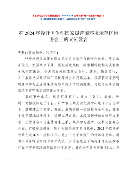 / 在2024年经开区争创国家级营商环境示范区推进会上的交流发言