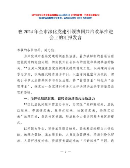 / 在2024年全市深化党建引领协同共治改革推进会上的汇报发言
