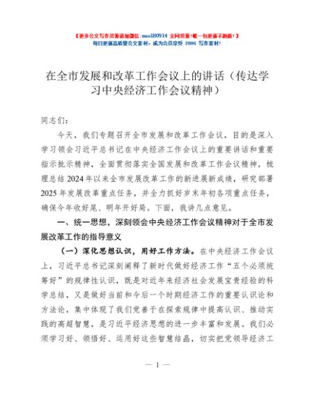 / 在全市发展和改革工作会议上的讲话(传达学习中央经济工作会议精神)