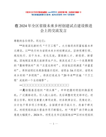 / 在2024年全区省级未来乡村创建试点建设推进会上的交流发言