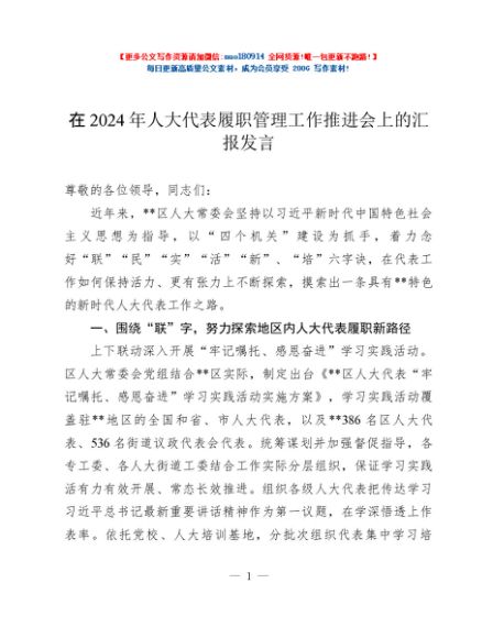 / 在2024年人大代表履职管理工作推进会上的汇报发言