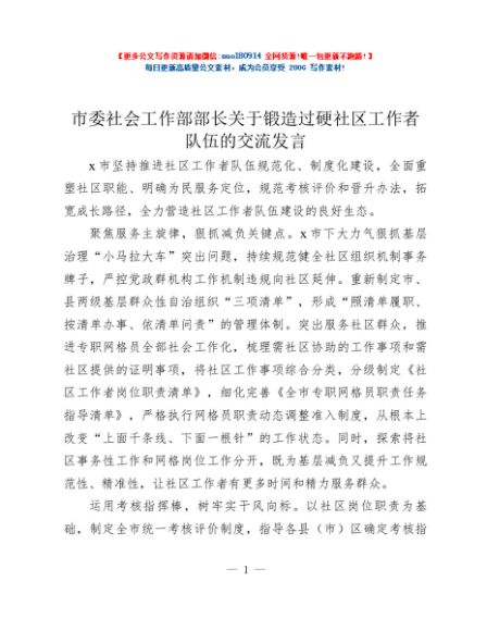 / 市委社会工作部部长关于锻造过硬社区工作者队伍的交流发言