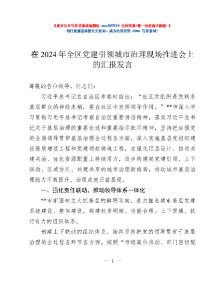 / 在2024年全区党建引领城市治理现场推进会上的汇报发言