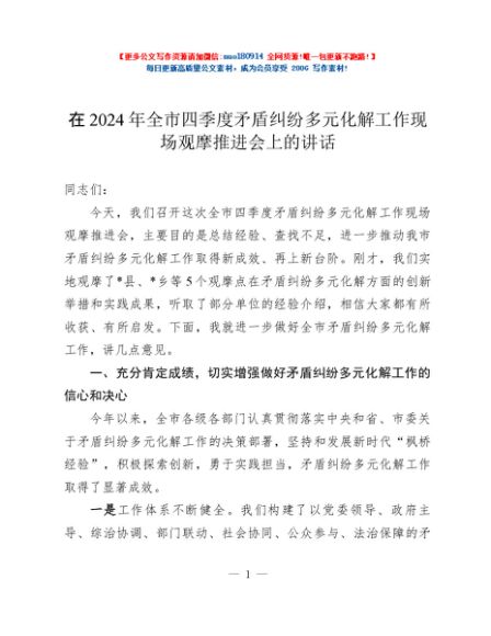 / 在2024年全市四季度矛盾纠纷多元化解工作现场观摩推进会上的讲话