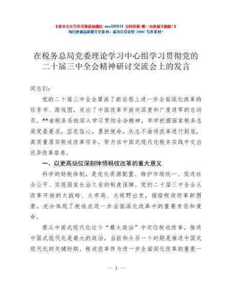 / 在税务总局党委理论学习中心组学习贯彻党的二十届三中全会精神研讨交流会上的发言