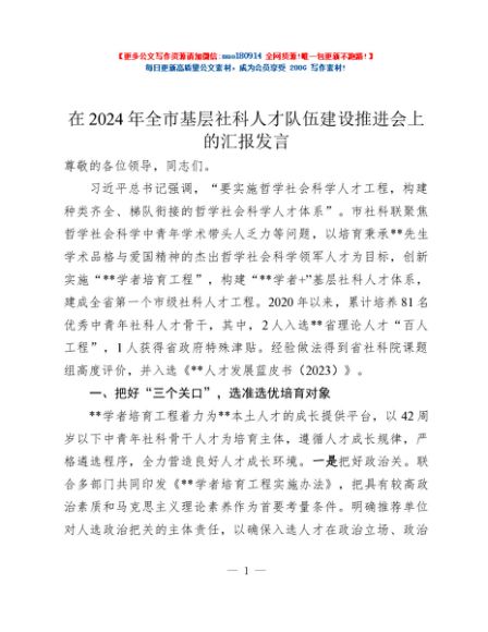 / 在2024年全市基层社科人才队伍建设推进会上的汇报发言
